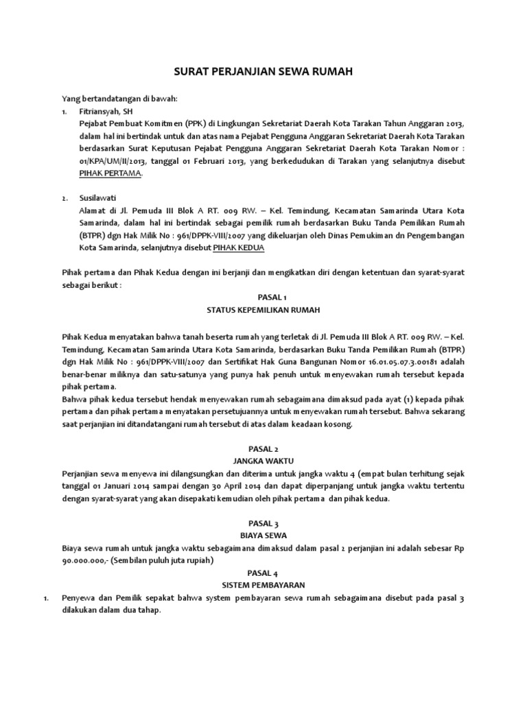 Surat perjanjian sewa ringkas memiliki kekuatan hukum yang sama dengan jenis surat lainnya jika dibubuhi tanda tangan dan juga materai. Surat perjanjian sewa rumah uploaded by wan. Surat perjanjian sewa rumah, kontrak rumah, dilengkapi dengan berita acara, surat perjanjian, sewa menyewa rumah, berita acara serah terima, sewa dimulai, sewa berakhir. Pasalnya, keberadaan surat perjanjian sewa rumah akan menghindarkanmu dari situasi yang tidak diinginkan di kemudian hari. Untuk menghindari kesalahpahaman dalam dunia sewa menyewa rumah antara kedua belah pihak maka diperlukan surat perjanjian sewa menyewa rumah yang biasa disebut dengan istilahnya hitam diatas putih. Contoh surat perjanjian kontrak rumah sederhana. Surat perjanjian sewa rumah sungguh prnting mesti tak menutup kemungkinan bahwa masih banyak orang yang tidak memperdulikan hal tersebut. Surat dibuat rangkap 2 yang dilengkapi tanda tangan penyewa dan pemberi sewa di atas. Sri lestari, pemilik rumah yang di kontrakan di desa. Acuan pembuatan surat perjanjian sewa rumah ini memiliki poin penting yang harus tercantum dalam surat tersebut. Rumah yang disewakan dalam perjanjian ini sepenuhnya merupakan hak pihak pertama, bebas dari sengketa, dan tidak dalam keadaan disewakan maupun dijual kepada pihak ketiga. Berikut ini adalah contoh surat perjanjian sewa rumah kontrakan terbaru. Surat perjanjian sewa rumah ini telah dibuat dengan berdasarkan pada ketentuan.